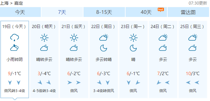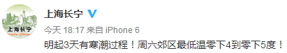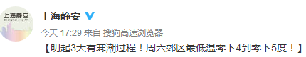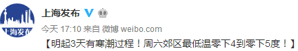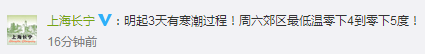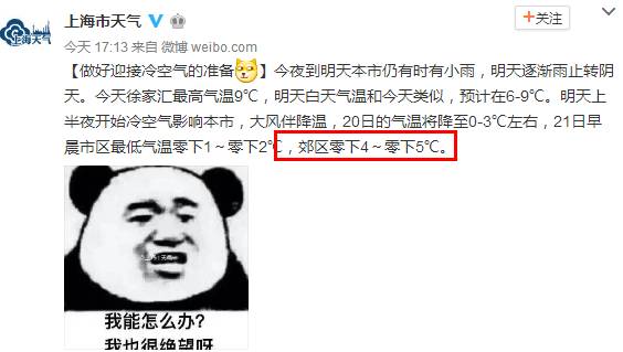 根据上海市气象局官网微信最新发布 今天冷空气开始影响本市 20日的气温将降至0~3℃左右 21日市区零下1℃~零下2℃ 郊区零下4℃~零下5℃