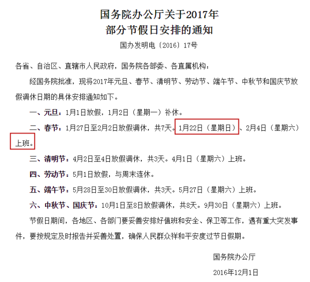 根据国务院办公厅的假期安排通知 1月22星期日将正常上班!