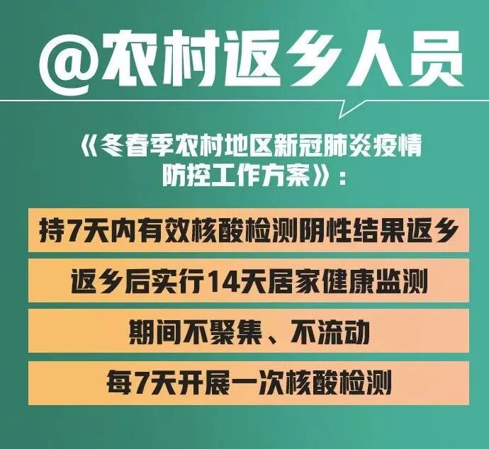 为什么要对返乡人员 加强疫情防控管理? 进入冬季以来,农村地区零星散发病例和局部聚集性疫情明显增加,严重影响当地正常生产生活秩序。农村地区防控能力薄弱,疫情防控难度大,特别是春运期间返乡人员明显增多,人员流动增大,将会进一步加大疫情传播风险。 为严格落实内防反弹的防控策略,对返乡人员加强疫情防控管理十分必要。核酸检测是目前尽早发现新冠病毒感染者的有效手段,要求返乡人员持核酸检测阴性证明能够有效降低疫情传入农村的风险,保障大家度过一个健康、平安的春节。 工作方案所指返乡人员 包括哪些人群? 工作方案所指返乡人员是指从外地返回农村地区的人员。 主要包括——