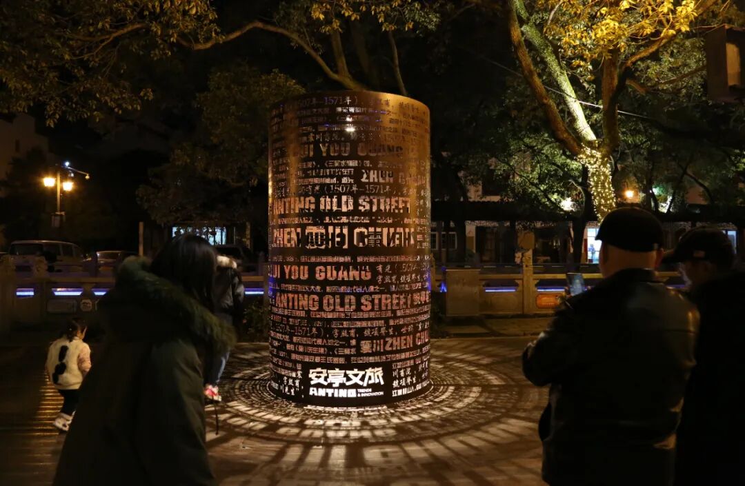 古铜色金属质感的圆柱结构上,写有对安亭有着教化之功的历史名人归有光与安亭的历史渊源。区别于一般的表现形式,这些文字呈镂空状,圆柱里设置了灯光,光束穿过文字,映射在地上,一圈一圈,煞是好看。“这种光影的感觉很特别,像年轮,符合我们年轻人的审美。”市民刘先生说。