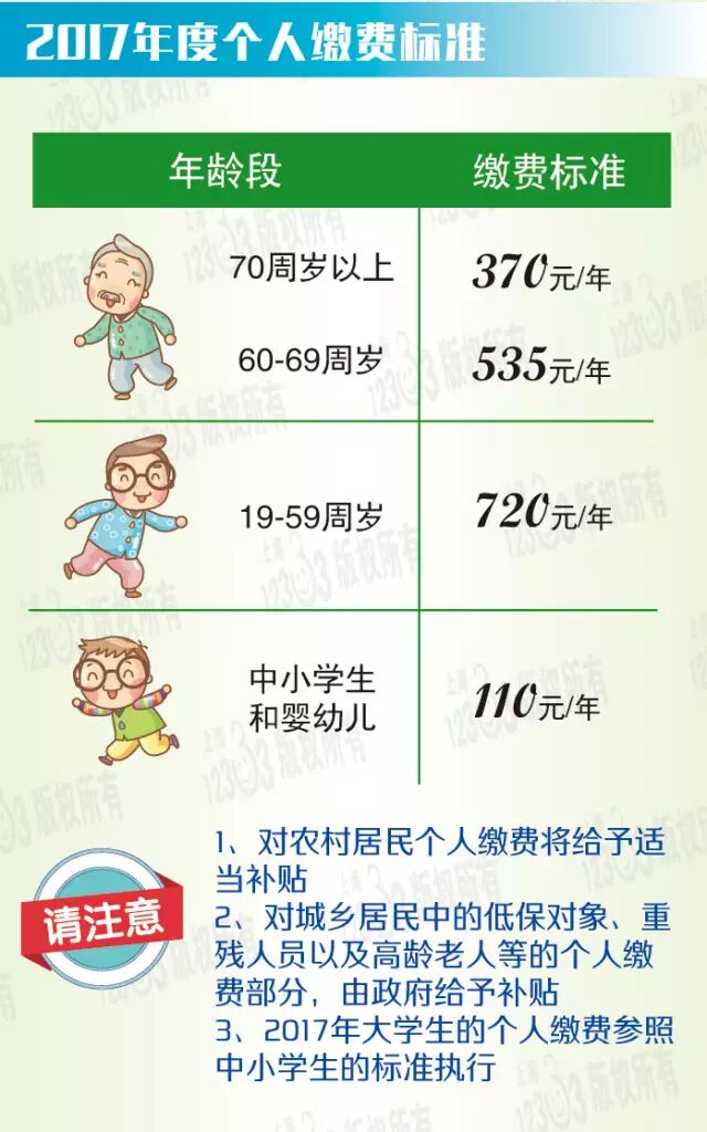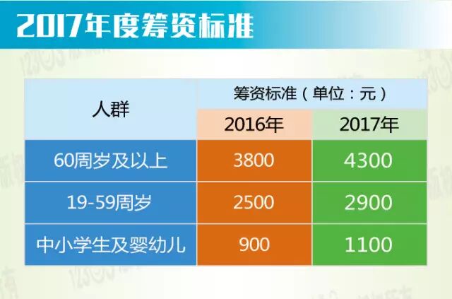 | 人社局今天发布,本市加大2017年城乡居民医保筹资标准,明年个人缴费标准按年龄分为4档,标准适当提高,其中中小学生和婴幼儿110元。今起至12月25日,请符合条件的居民在规定期限内及时办理登记参保手续,逾期参保将有3个月等待期,等待期满后方可享受城乡居民医保待遇。具体调整详见下文。