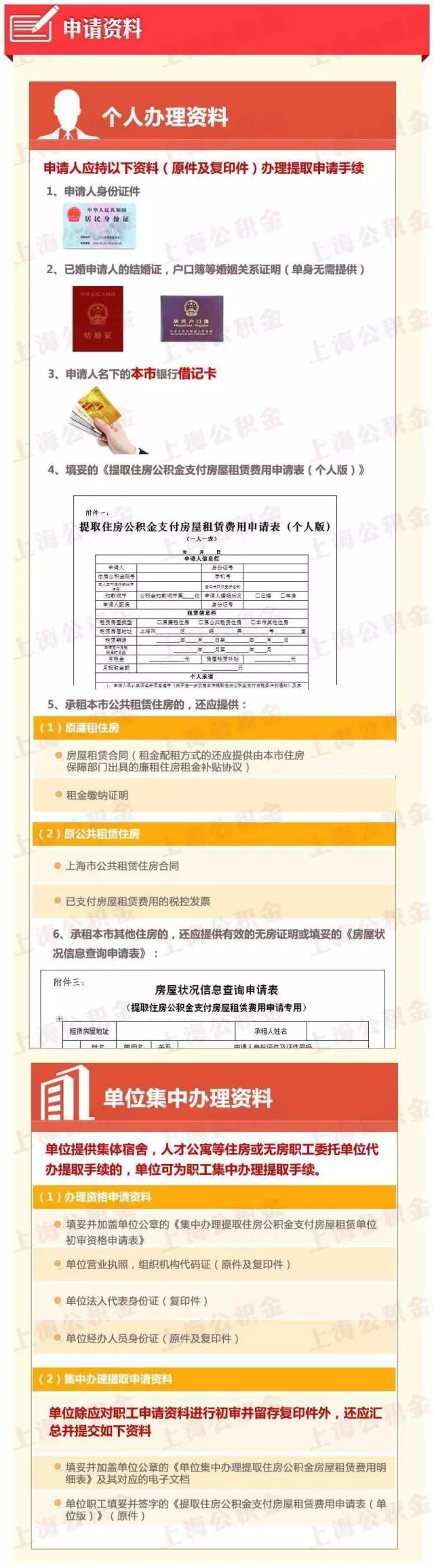 根据上海市《关于进一步放宽本市提取住房公积金 支付房租条件的通知》 小编对租房提取公积金流程 进行了归纳总结。 首先,公积金租房办理分为 个人办理和单位集中办理两种。 个人办理: 职工符合提取条件的,可向本市上海市公积金管理中心任一区(县)管理部提出申请,并按规定提供相关申请资料。 位集中办理: 单位为职工集中办理提取手续的,可向本市上海市公积金管理中心任一区(县)管理部提出申请,并按规定提供相关申请资料。 租房提取条件职工(以下称申请人)租赁住房符合下列条件的, 可以申请提取本人及配偶住房公积金账户内的存储余额, 用于支付房屋租赁费用: 1、申请人在本市连续缴存住房公积金满3个月; 2、申请人及配偶目前在本市无自有住房且租赁住房的; 3、申请人及配偶目前无住房公积金贷款、无提取住房公积金归还住房贷款委托等约定提取委托; 4、申请人及配偶仅可提取住房公积金支付一套房屋的租赁费用; 5、申请人及配偶的租赁行为应符合本市房屋租赁相关规定。