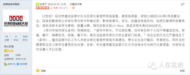 最近,建设监察中队工作人员与区绿化管理所联系,并一同赶赴现场查看。据现场调查,绿地21城B区333弄3号别墅业主,因其别墅南侧公共绿化带内树木种植过密,影响其通风、采光,故擅自将其砍伐。经绿化管理所测算核实,被砍伐树木品种为意杨,数量18棵,胸径多数达到15-20cm,其经济损失高达9000多元。