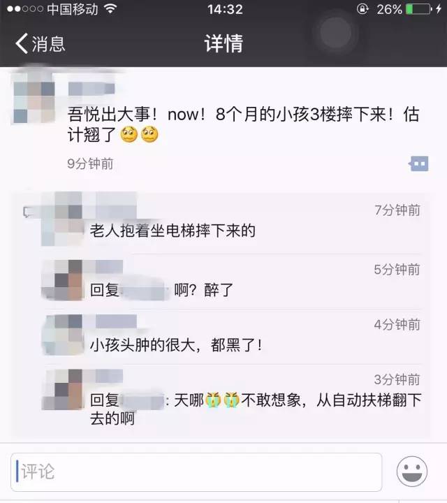 11月11日下午2点30分左右,上海青浦区吾悦广场发生一起意外,一年仅4个月的男婴不慎从3楼高度的自动扶梯上坠落,送医后抢救无效死亡。 事故发生后,男婴的家属紧紧抱住孩子痛哭不已。商场保安人员帮忙疏散围观群众。 看到这个画面都觉得心里一紧!建议WIFI下观看视频