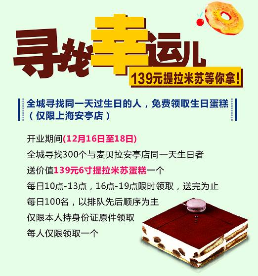 12月18日(周日)18:30-20:00 麦贝拉安亭店二楼西餐厅(市民广场斜对面)
