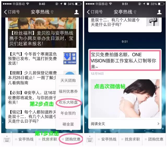 同时参与安亭热线大转盘游戏中奖即可获得! 活动细则重要说明: 1、请大家将中奖信息页面截图保留,以免因为下次游戏覆盖中奖纪录。 2、大家凭中奖手机号码及SN码电话预约拍摄即可兑换,当天中奖的隔天之后方能预约使用。 欢乐大转盘游戏截止时间:12月19日 奖品电话预约兑换截止时间:12月31日 欢乐大转盘游戏通道 (1)在安亭热线微信后台菜单右下角,在“团购优惠”菜单中选择“欢乐大转盘”;随后出现 宝贝免费拍摄名额,ONE VISION 摄影工作室私人订制等你来链接。