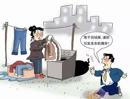 相关案例 案例一 2013年,石家庄一女子在家用洗衣机洗羽绒服,突然“砰”的一声,洗衣机发生“爆炸”,羽绒服被炸成好几块,洗衣机盖也被炸飞了。 案例二 2014年1月,郑州一女子在使用洗衣机洗羽绒服时发生爆炸,随后她投诉洗衣机质量问题,被销售人员告知,说明书上明确标明:不得清洗羽绒服。 案例三 西安某市民把洗好的羽绒衣放入双缸洗衣机的甩干缸进行脱水时,第一次洗衣机抖得厉害,她当时调整了一下继续用,没想到刚离开就听见“嘭”的一声巨响,洗衣机居然爆炸了,顶盖被炸飞,洗衣缸下边也破裂。 一般会爆炸的羽绒服都有防水面料,透气性差、里面的空气难以排出等特点,而且爆炸几乎都发生在脱水甩干过程中。